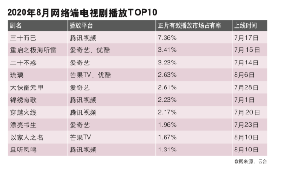 古裝劇中,騰訊視頻《錦繡南歌》及優(yōu)酷、芒果TV《琉璃》突圍?!读鹆А犯木幾匀藲庀蓚b小說(shuō)《琉璃美人煞》,劇集起用新生代演員,主角CP感獲贊,開播之初便備受期待,劇集品質(zhì)也收獲高口碑。古裝權(quán)謀劇《錦繡南歌》由實(shí)力派演員秦昊演繹,獲得高關(guān)注度。
