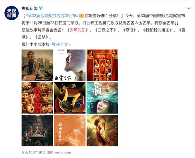 第33屆中國電影金雞獎提名名單公布,其中電影《少年的你》獲得最佳導(dǎo)演,最佳故事片,最佳編劇、最佳男女主角等11項提名。