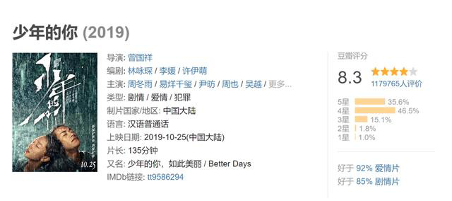 直到如今,《少年的你》豆瓣評分穩(wěn)定在8.3分,主演周冬雨和易烊千璽的表現(xiàn)力十足,整部作品對現(xiàn)實問題的反饋刻畫細(xì)膩,再加上出彩的攝影技法,讓該作品在上映之時就獲得了15億的高票房,被認(rèn)為是一匹黑馬,獲得了口碑票房的雙豐收。