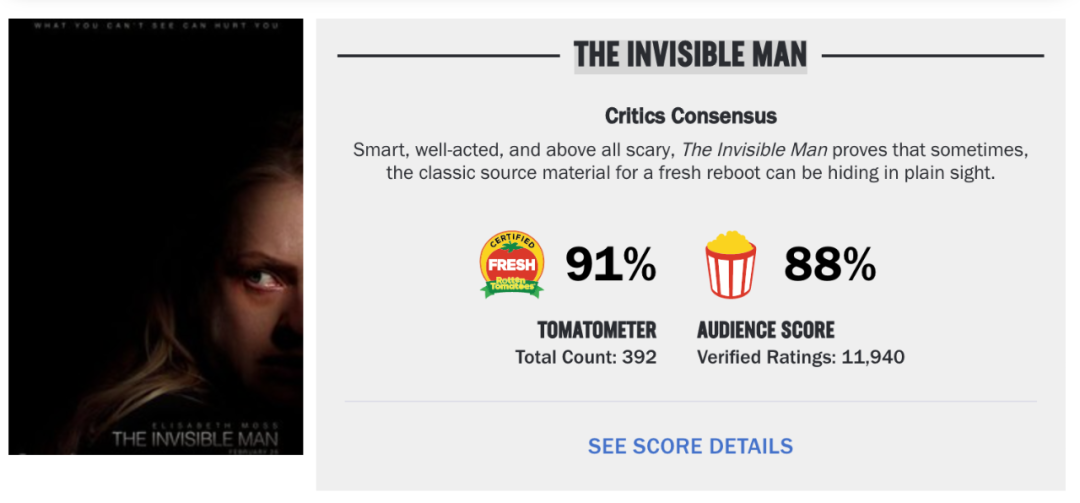 《隱形人》借由女性逃離控制狂丈夫的傷害、尋找獨(dú)立自由生活的故事,和當(dāng)下的時(shí)代思潮實(shí)現(xiàn)了一次共振,而這也是影片在口碑上大獲成功的原因之一。