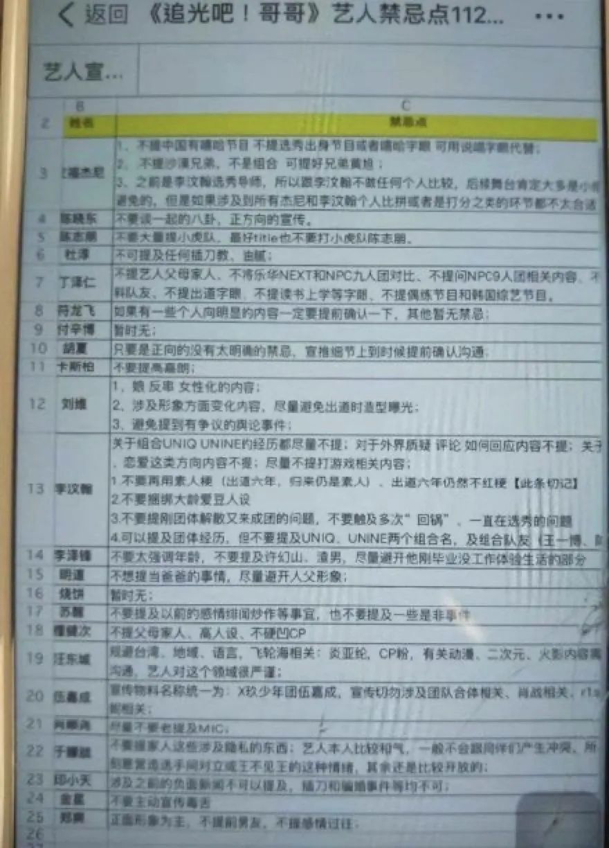 從昨晚到今天,一張《追光吧哥哥》藝人禁忌點(diǎn)圖片在社交平臺(tái)上不斷流傳,最終登上了微博熱搜。