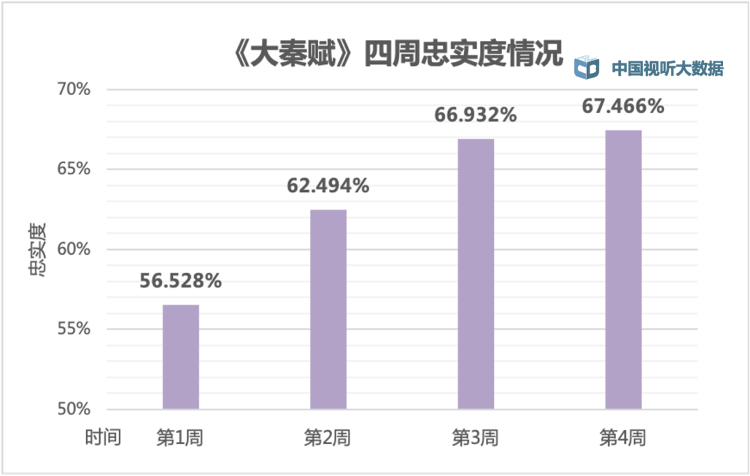 歷史劇《大秦賦》在CCTV-8電視劇頻道播出4周,各周忠實度不斷上漲,回看用戶規(guī)模連續(xù)3周進入黃金時段電視劇前2,節(jié)目黏性表現(xiàn)突出,且不斷釋放收視吸引力,本周追劇觀眾中有33.243%的新觀眾。該劇每集平均到達率2.059%、忠實度67.466%、收視率1.382%,均位居本周黃金時段電視劇單頻道收視指標(biāo)第1。