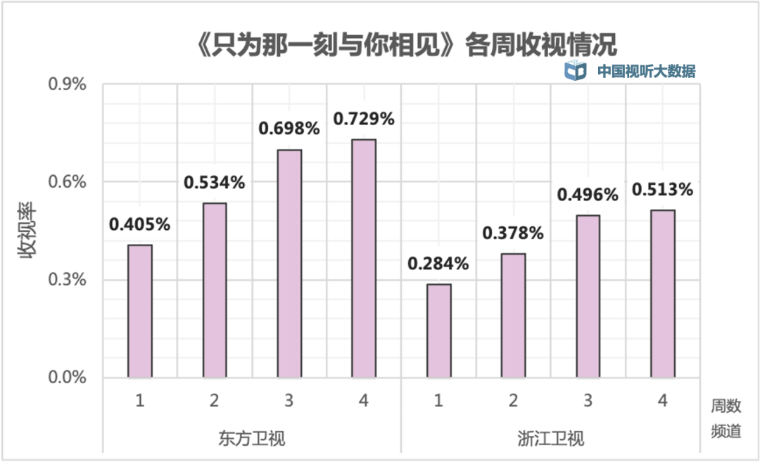 都市情感劇《只為那一刻與你相見》于11月28日登陸東方衛(wèi)視和浙江衛(wèi)視,12月19日迎來大結(jié)局,播出4周來收視穩(wěn)步提升。本周該劇僅播大結(jié)局1集,在兩頻道的收視率分別為0.729%和0.513%,均進入地方衛(wèi)視黃金時段電視劇單頻道收視率前3,較開播周上漲80.0%和80.6%。
