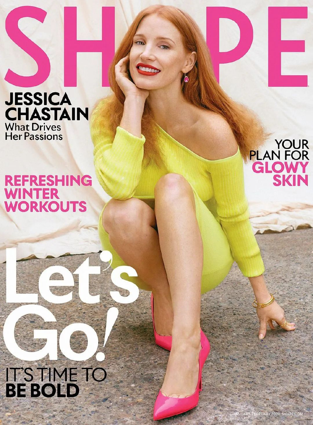 “勞模姐”杰西卡·查斯坦登上新一期SHAPE雜志封面,艷麗紅唇、黃色露肩禮服、芭比粉漆皮高跟鞋,親和力和活力滿滿。