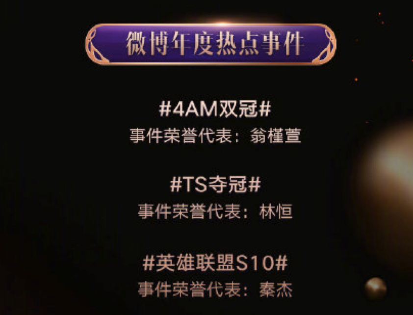 年度微博熱點(diǎn)事件,全部是電競相關(guān)的話題。這說明,不管外界對于電競和游戲的爭議如何,但從流量到商業(yè)變現(xiàn)的可能性,作為平臺的微博是最有感觸的。事實(shí)上,電競和游戲的用戶和粉絲們的熱情一點(diǎn)也不遜色于飯圈,從微博熱點(diǎn)人物到微博熱點(diǎn)事件中出現(xiàn)的游戲圈中人,就可見一斑。
