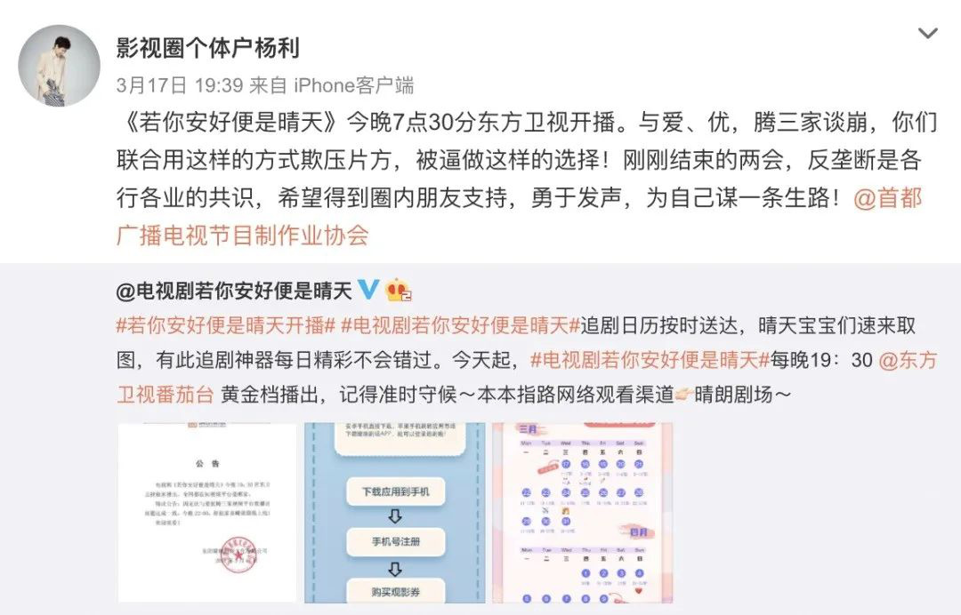 3月18日,電視劇《若你安便是晴天》(簡稱《若你安好》)制片人楊利,微博發(fā)表長文“我喜歡這個(gè)世界公平的樣子”,文章中,楊利稱愛優(yōu)騰三家視頻網(wǎng)站聯(lián)合壓價(jià)自己的版權(quán)劇,將其制作成本上億的作品壓制單集20萬(在接受媒體采訪中表示)。