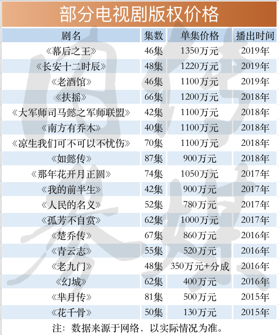 (過往幾年電視劇版權(quán)價(jià)格類比)