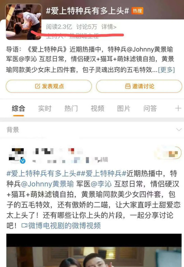 《愛(ài)上特種兵》開(kāi)播后,小編是無(wú)比激動(dòng)。在各類(lèi)社交平臺(tái)上,數(shù)據(jù)和熱度都還不錯(cuò)。在新浪微博上的話(huà)題#愛(ài)上特種兵有多上頭#,閱讀量已達(dá)到2.3億,討論5萬(wàn)。