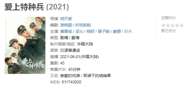 《愛上特種兵》播出后,也算是滿足了觀眾。黃景瑜和李沁的粉絲幾乎都高興壞了,畢竟自家偶像演繹的軍旅劇。論題材還是論人設(shè)都是杠杠的,具備爆火的潛質(zhì)。但整體播出后,粉絲們集體哭暈在廁所,自家偶像們組CP的劇徹底撲街了。截至目前,《愛上特別兵》豆瓣都沒有評分,差評較多。