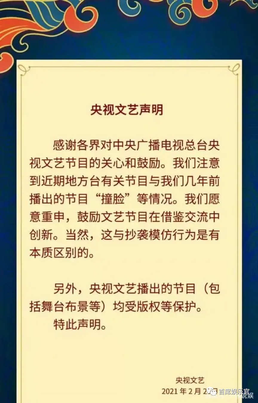 聲明寫道:“我們注意到近期地方臺有關(guān)節(jié)目與我們幾年前播出的節(jié)目“撞臉”等情況。我們愿意重申,鼓勵文藝節(jié)目在借鑒交流中創(chuàng)新。央視文藝沒有憑借內(nèi)容走紅,反倒通過發(fā)聲明的舉措給給自己招黑?!?/p>