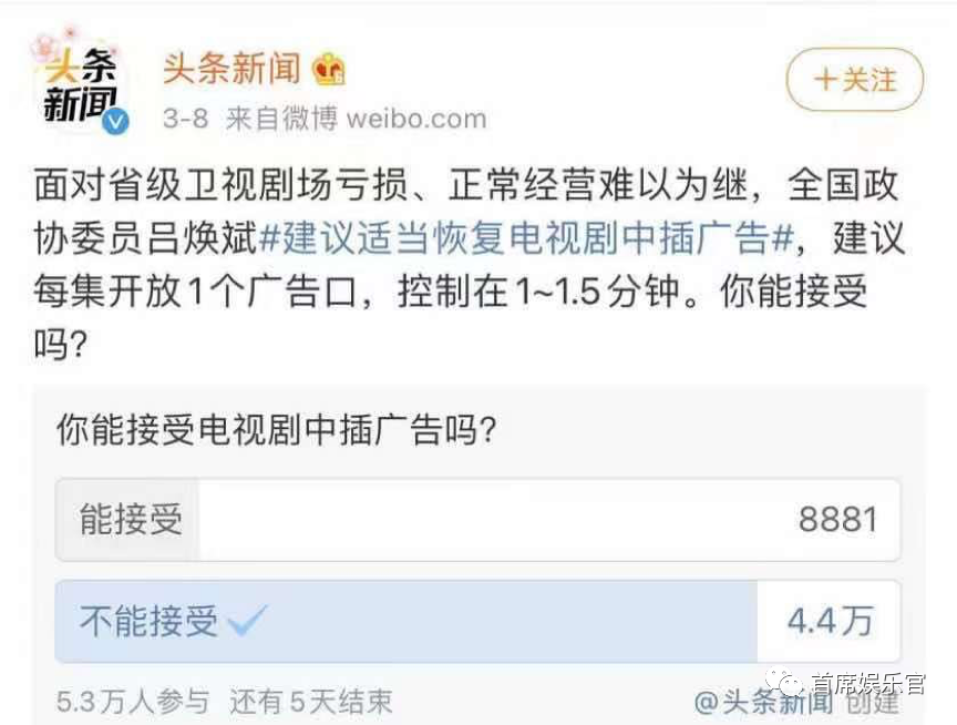 今年兩會期間,曾任湖南廣播電視臺臺長的政協(xié)委員呂煥斌提出了《關(guān)于適當恢復(fù)電視劇中插廣告的提案》,頭條新聞還在微博上發(fā)起了討論,結(jié)果83%的網(wǎng)友投了不能接受的票。這也是由于在網(wǎng)絡(luò)平臺的猛烈沖擊之下,電視臺廣告費收入急劇下降。