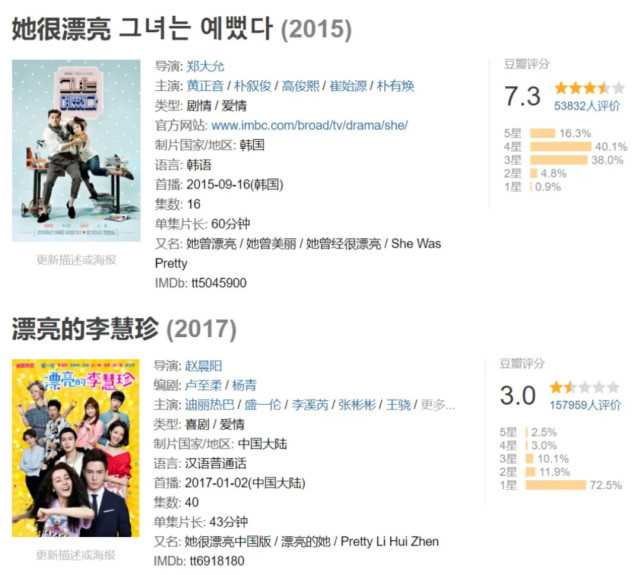 同樣有這個(gè)問題的還有迪麗熱巴主演的電視劇《漂亮的李慧珍》,這部劇改編自韓劇《她很漂亮》,原劇中為了體現(xiàn)女主前期與后期的差距,剛開始的造型極盡丑陋,而翻拍之后的劇女主的造型只是一頭泡面頭,臉上幾粒雀斑,仍是一個(gè)美人坯子。