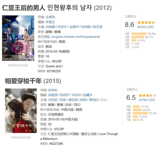 例如電視劇《相愛穿梭千年》便是改編自韓劇《仁顯王后的男人》,原版同樣是人氣非常高的電視劇,幾位主演也都憑借這部劇出名,但翻拍后的電視劇便不盡如人意了。