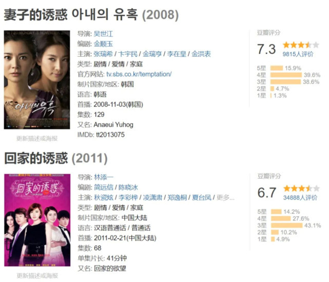 此外,還有大家耳熟能詳?shù)碾娨晞?strong>《回家的誘惑》,翻拍自韓劇《妻子的誘惑》,雖然無論是原版還是翻拍后的作品劇情都相當(dāng)狗血,但這也正說明了翻拍后的作品尊重原版,劇情相差無幾。