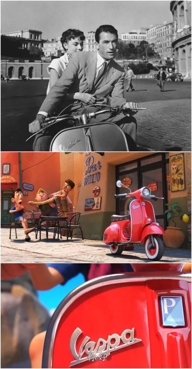 比如片中致敬著名的意大利電影《羅馬假日》,奧黛麗·赫本和格里高利·派克一起騎的,正是影片中的同款Vespa牌小摩托。