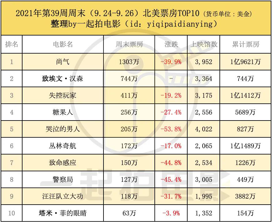 《失控玩家》進(jìn)入第7周后止住排片狂砍趨勢(shì)再度收窄跌幅,目前成為是今年好萊塢票房第5高的影片了?!吨旅袘?yīng)》則一路失速狂跌虧損避無(wú)可避,會(huì)成為溫子仁彪炳的商業(yè)片導(dǎo)演史上重大污點(diǎn),周末其在73個(gè)市場(chǎng)近4000張屏幕上堪堪收入290萬(wàn)美元,目前僅剩下6個(gè)市場(chǎng)待公映,最終將倒在4000萬(wàn)美元線上。