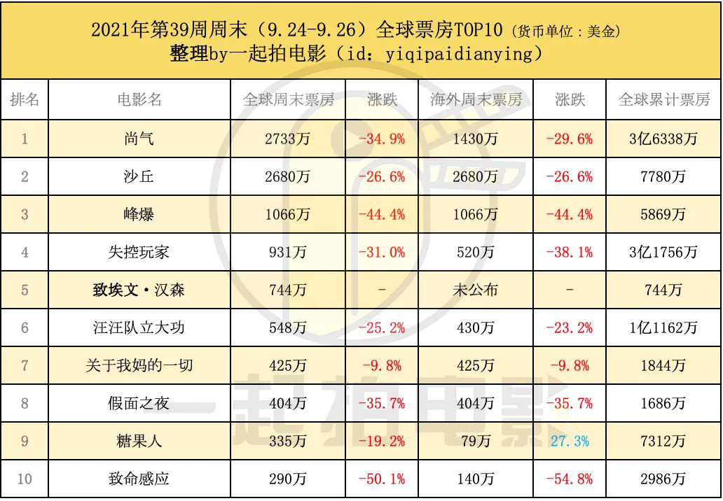 上周末全球票房大盤創(chuàng)下本輪疫情恢復(fù)期以來(lái)最低記錄,其中內(nèi)地僅有2500萬(wàn)美元,北美不足4000萬(wàn)美元,全球更是跌破1億美元。不過(guò)好在國(guó)慶檔期將來(lái),各路大片現(xiàn)身銀幕,市場(chǎng)預(yù)計(jì)將會(huì)有非常強(qiáng)烈反彈本周末大盤有望超過(guò)3億美元。