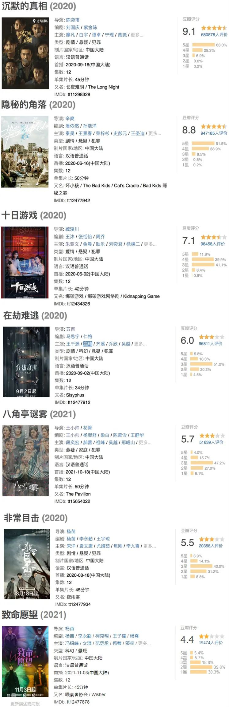 >《隱秘的角落》《沉默的真相》都改編自紫金陳的小說,這兩部短劇都穩(wěn)居迷霧劇場的口碑前兩名,其余六部作品則口碑參差不齊。