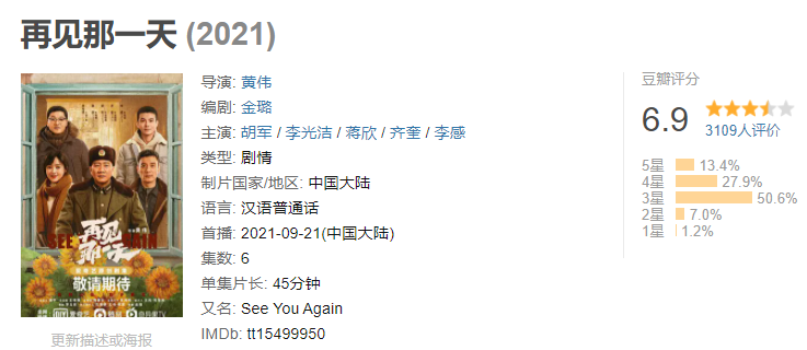 >僅有6集的《再見,那一天》,用了3天就播完了,豆瓣小組討論量為0,評分6.9,但是評分人數(shù)只有3109人。相比去年第一部播出的改編自東野圭吾作品的《十日游戲》,熱度相去甚遠。