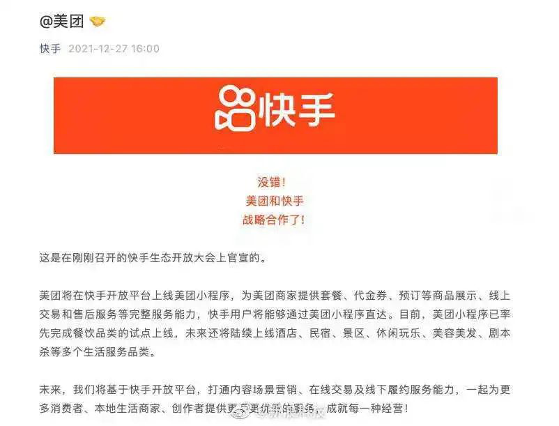 ·快手美團達成互聯互通合作:美團將在快手上線小程序