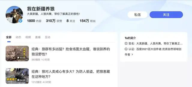 3年多的時(shí)間里,“我在新疆養(yǎng)狼”這個(gè)賬號(hào)幾乎保持著日更的速度,累計(jì)發(fā)布了1159條視頻,收獲了154萬與她一起“云養(yǎng)狼”的觀眾。