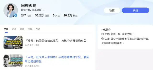 她的內(nèi)容也獲得了百度百家號(hào)的認(rèn)可,在平臺(tái)的扶持下,獲得千萬級(jí)的流量推薦,一對(duì)一定制服務(wù)等。截至目前,“田柳觀察”的百度百家號(hào)粉絲數(shù)達(dá)20.8萬。