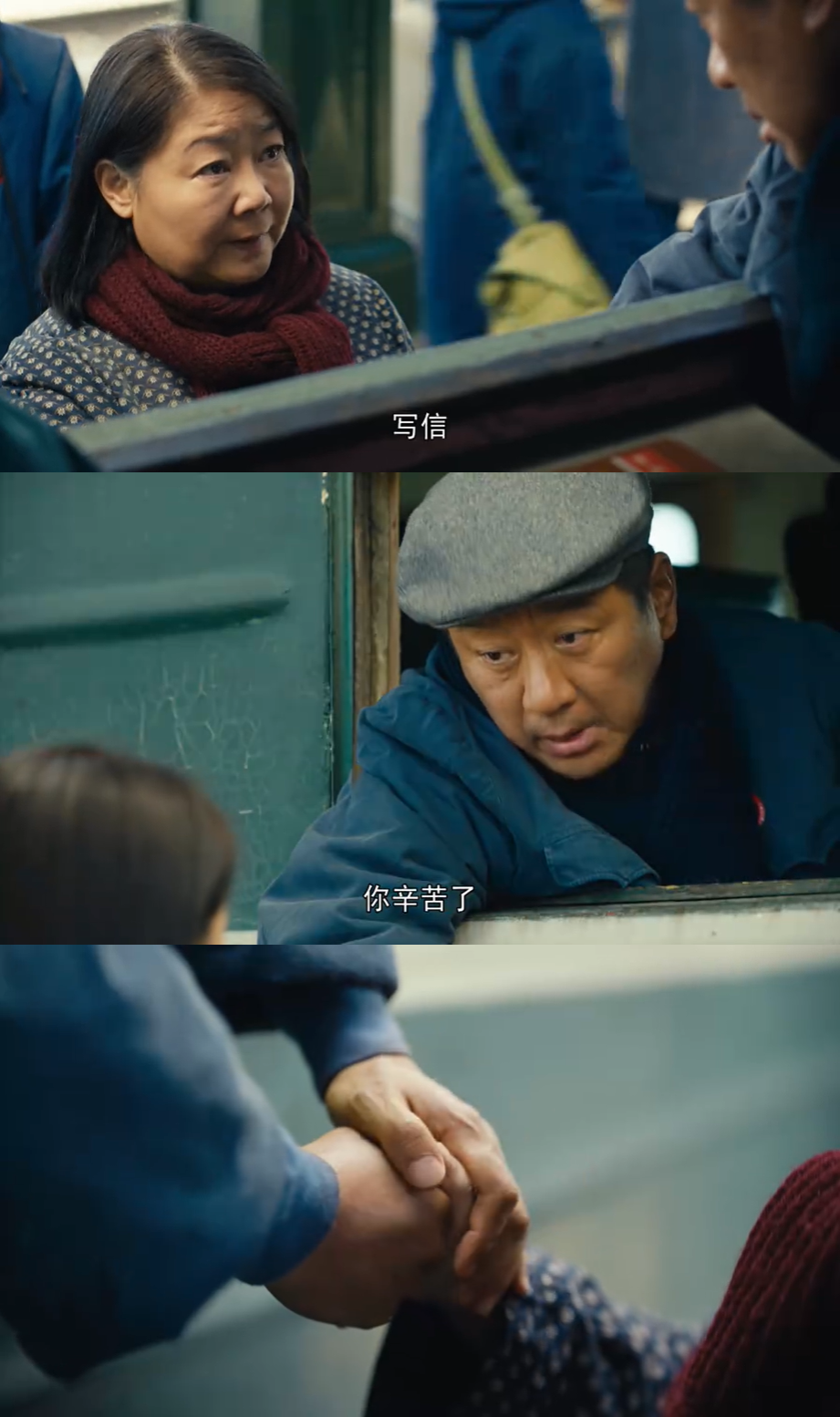 在火車車窗前的分別,母親和父親,悄無聲息地握緊雙手。