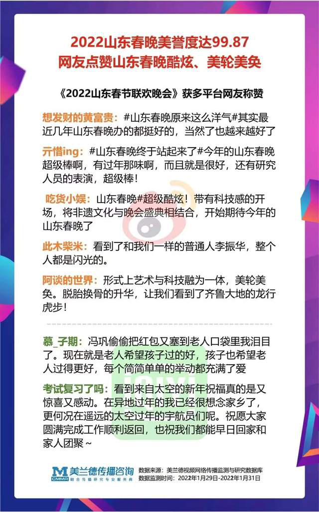 據(jù)美蘭德視頻網(wǎng)絡(luò)傳播監(jiān)測(cè)與研究數(shù)據(jù)庫(kù)公布的信息,山東春晚網(wǎng)絡(luò)融合傳播影響力在播出當(dāng)天位列電視綜藝第二位,美譽(yù)度高達(dá)99.87%,超過(guò)六成的傳播報(bào)道來(lái)自省外,突破本地圈層實(shí)現(xiàn)全域擴(kuò)散。