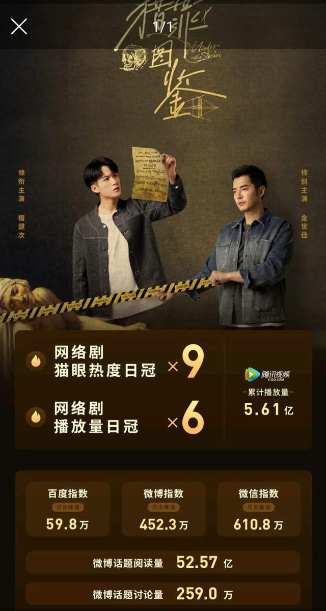 《獵罪圖鑒》剛上線(xiàn)時(shí),也很受爭(zhēng)議,口碑兩極化,有的觀(guān)眾認(rèn)為該劇節(jié)奏明快,案子要講的故事也算新穎,但也有的觀(guān)眾認(rèn)為該劇破案過(guò)程太簡(jiǎn)單,還總是依靠男主的畫(huà)像才破案,覺(jué)得太傳奇,然而,無(wú)論觀(guān)眾爭(zhēng)議如何,《獵罪圖鑒》的熱度卻是上去了,不但連續(xù)9日奪得貓眼熱度的日冠軍,播放量也連續(xù)6日奪冠。微博話(huà)題閱讀量52億之多。