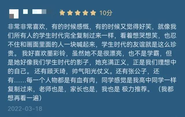 熒幕中高中生們真實(shí)而熱烈的生活打動(dòng)了很多觀眾,看到他們不禁又回想起學(xué)生時(shí)代的珍貴友誼。而墨彩寧正像是大多數(shù)普通女生的縮影,不夠漂亮,也不是學(xué)霸,但是她熱心仗義。片中的每個(gè)人物都有血有肉,每看一遍都覺(jué)得像是重溫了一遍高中生活。