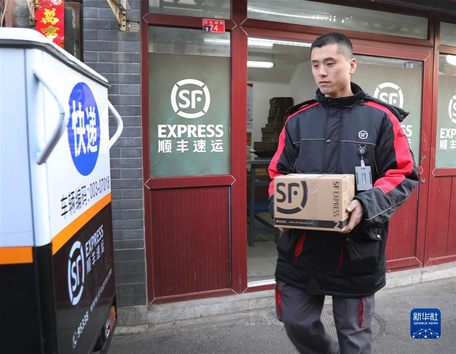 | 北京前門石頭胡同快遞站點“快遞小哥”劉闊在整理包裹(2019年2月1日攝)。新華社記者 李德欣 攝 |