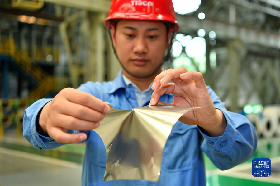 | 在位于山西的太鋼集團(tuán),員工在展示用手撕開0.02毫米厚的超薄帶狀不銹鋼(2019年5月24日攝)。新華社記者 曹陽 攝 |