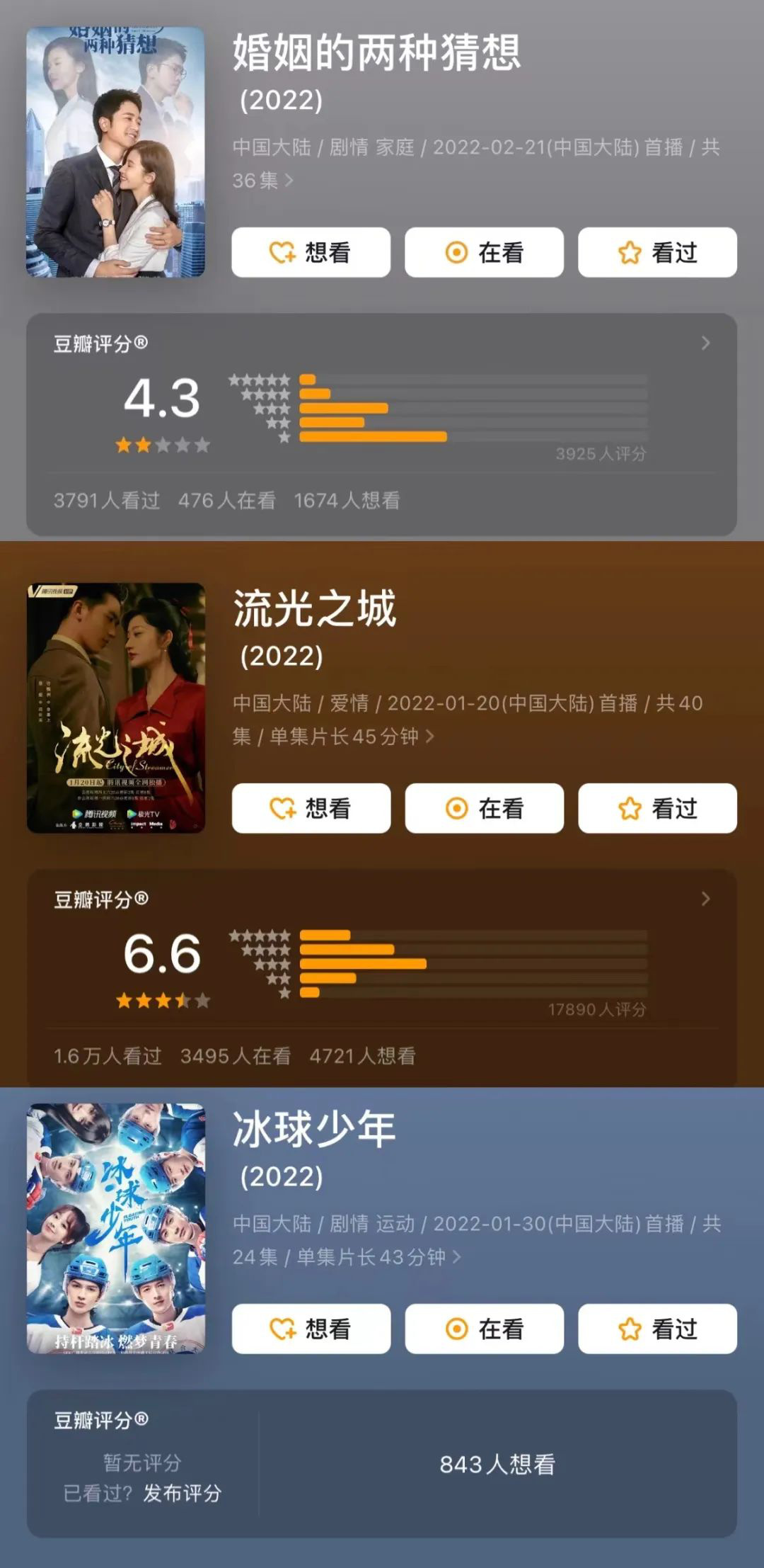 得益于資產(chǎn)減值,公司雖將2021年的凈虧損從2020年的3.52億元降低至2.34億元,但影視板塊收入下降40%。而《流光之城》《冰球少年》《婚姻的兩種猜想》這三部已于2022年播出的劇集,也僅帶來了收入層面的助力,播出期間的熱度表現(xiàn)皆不溫不火。