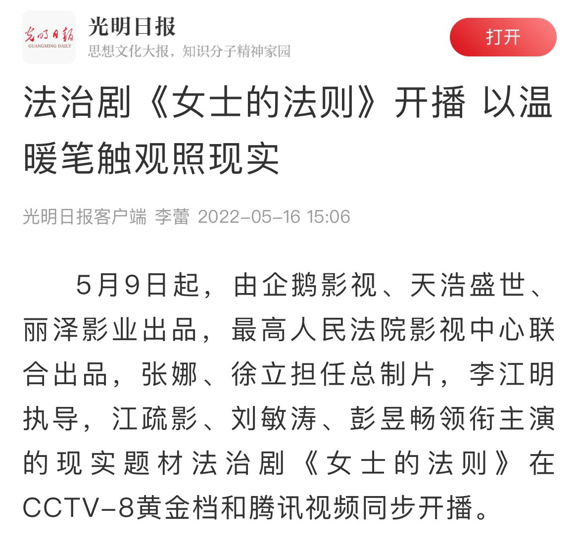 央視八套、騰訊視頻熱播電視劇《女士的法則》收官在即。自開播以來,劇集接連獲得最高人民法院、央視一套《今日說法》、《人民法院報》、《光明日報》點贊,被評“以溫暖筆觸觀照現(xiàn)實”,“展現(xiàn)法治的光輝力量”。這是天浩盛世娛樂今年播出的第三部劇集。