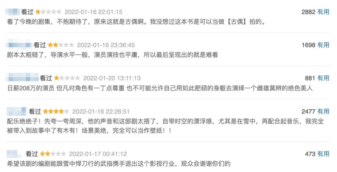 “放以前就是及格,現(xiàn)在吊打擺爛古偶,求不要爛尾?!庇芯W(wǎng)友也發(fā)出了如此的評(píng)價(jià)。