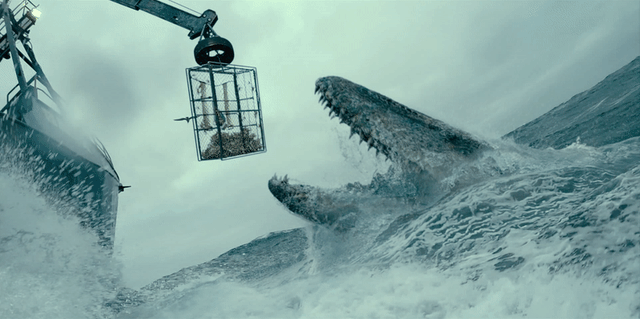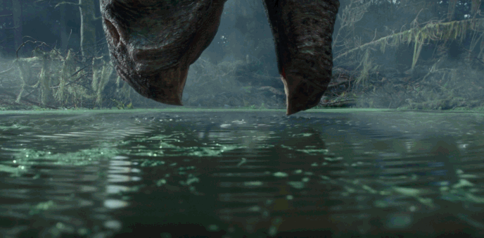 女主角克萊爾在山谷中潛入水底,水面上是“鐮刀龍”步步緊逼,場面壯觀。