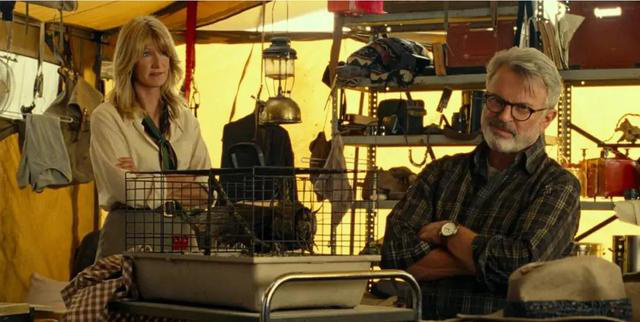 除了上一部主演悉數(shù)回歸,這一部還請(qǐng)來《侏羅紀(jì)公園》的三位重量級(jí)“前輩”主演——山姆·尼爾、勞拉·鄧恩、杰夫·高布倫。
