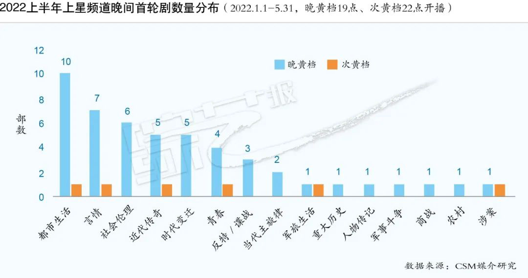 二是傳統(tǒng)大類題材出現(xiàn)回暖潮流。2022年1—5月,上星頻道晚黃檔共推出49部首輪劇,都市生活、言情、社會倫理、近代傳奇這四大類傳統(tǒng)題材各占10、7、6、5部,以28部、總占比57%的勢頭重新霸屏,再現(xiàn)昔日高光勢頭。相對于2021年“新貴”題材層出不窮的盛景,2022上半年小類題材上新頗顯中規(guī)中矩。其中,時代變遷劇表現(xiàn)突出占5部,青春題材占4部,反特/諜戰(zhàn)占3部,當代主旋律占2部,軍旅生活、重大歷史、人物傳記、軍事斗爭、商戰(zhàn)、農村、涉案各占1部。上星頻道在晚間次黃金檔(以下簡稱次黃檔)僅播出6部首輪劇,因而題材種類較少,包括涉案、時代變遷、都市生活、青春、言情、軍旅生活。