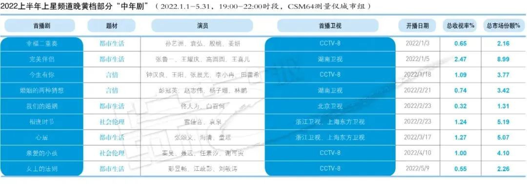 湖南衛(wèi)視以《完美伴侶》(2022年1月5日播出)作為開年大戲,抒寫了中年職場女性如何平衡家庭和事業(yè)的困境,收視率突破2.4%;隨后又播出《婚姻的兩種猜想》(2022年2月21日播出),以輕喜劇風格描寫而立之年職業(yè)女性的“閃婚”生活。北京衛(wèi)視以《我們的婚姻》(2022年2月23日播出)進行對壘打,全職太太重返職場、與丈夫共同成長,引發(fā)觀眾熱議。浙江衛(wèi)視和上海東方衛(wèi)視聯(lián)播《心居》(2022年3月17日播出),講述外來小媳婦變身單親媽媽后,開始追尋自身價值的勵志故事。