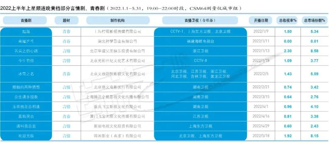 2022上半年,上星平臺針對年輕觀眾投放了一系列偏青春情感表達的劇目,在差異化競爭和協(xié)同傳播主旋律上做出了新探索,“言情”市場出現(xiàn)了新趨向、新劇風。