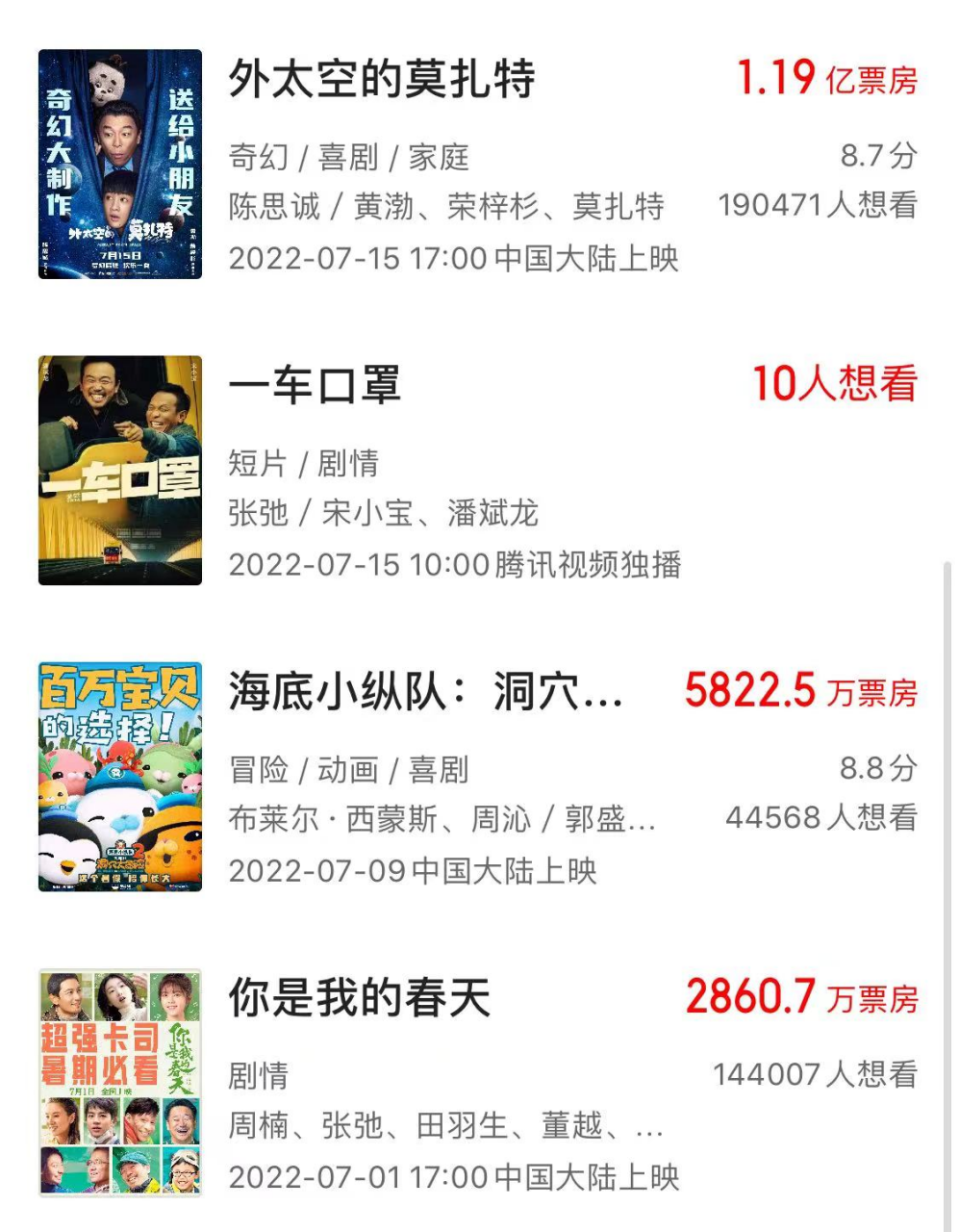 現(xiàn)在連陳思誠(chéng)這顆搖錢(qián)樹(shù)都不靈了,可想而知“曾茂軍們”的確很難向王健林交代。整個(gè)上半年,因?yàn)橐咔榉磸?fù),萬(wàn)達(dá)沒(méi)有上映一部電影。到7月,一口氣上映三部電影,結(jié)果票房都撲街了。其中,群星參演的抗疫片《你是我的春天》票房三千萬(wàn)不到,國(guó)外導(dǎo)演執(zhí)導(dǎo)的動(dòng)畫(huà)片《海底小縱隊(duì)》票房只賣(mài)了五千多萬(wàn)。