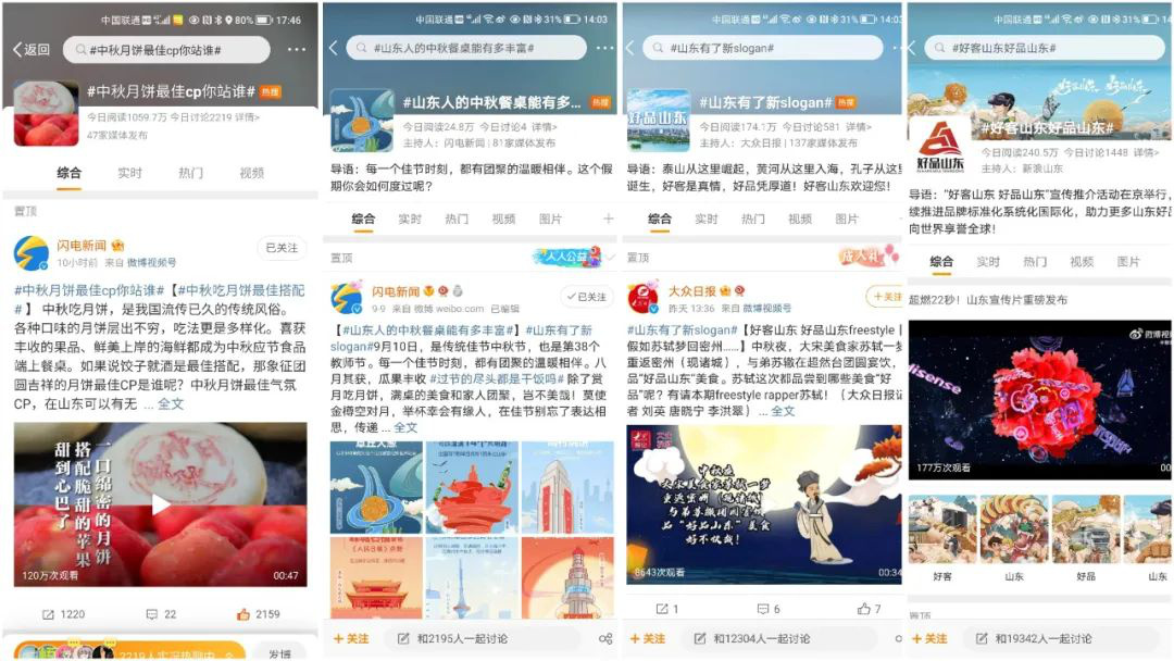 中秋節(jié)期間,山東好品全平臺相關(guān)話題閱讀量累計超過21.4億人次,4個話題詞條登上新浪熱搜。@閃電新聞微博策劃#山東人的中秋餐桌能有多豐富# 話題詞條,沖上微博熱搜,登上熱搜推薦榜第7,話題閱讀量達(dá)到1.5億。結(jié)合中秋節(jié)日氣氛,@閃電新聞策劃#中秋月餅最佳cp你站誰# 話題,以中秋月餅最佳搭配的山東好品形式進(jìn)行推廣,話題在榜近2個小時,閱讀量超過4400萬。同時,微博話題#好客山東好品山東# 沖上全國熱搜第三位,話題閱讀量達(dá)2.4億;#山東有了新slogan# 話題閱讀量1.2億。