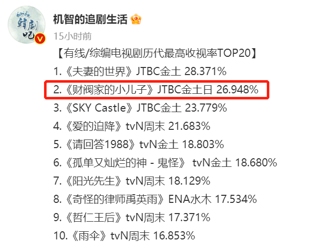 這部劇到底有多火?收視一路飆升,大結(jié)局全國收視26.948%,刷新自身最高記錄,實時收視更是飆到了51.12%,目前是有線臺歷代電視劇收視第二(未能打敗狗血劇《夫妻的世界》)。