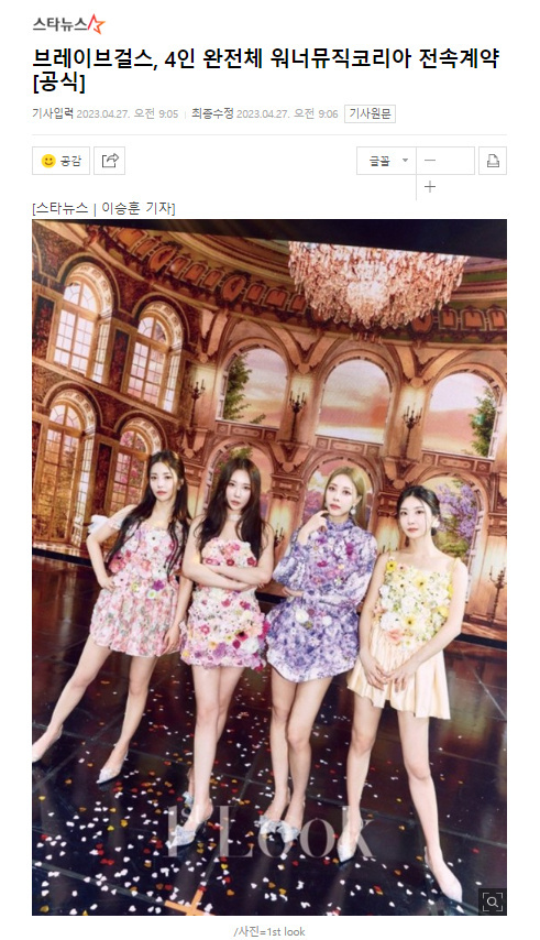 27日Warner Music Korea方面表示:“已經(jīng)與Brave Girls全員簽訂了專屬合約,與成員們一同決定將把組合完整體活動放在首位。在活動方面,我們將進行全力支援?!绷硗鈱τ诮M合名稱,所屬社方面表示:“正在多角度討論中?!毙媪私M合第二幕的開始。