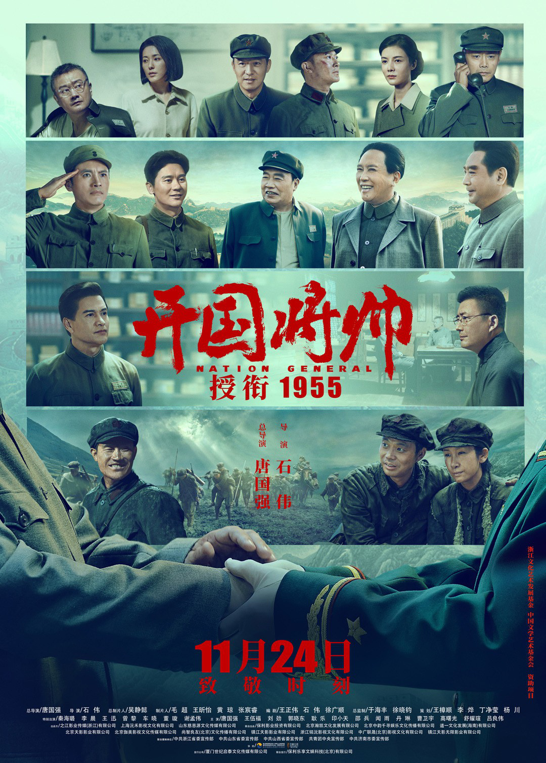 電影《開國將帥授銜1955》由之江影業(yè)傳媒(浙江)有限公司、上海沅禾影視文化有限公司、山東慈恩源文化傳媒有限公司出品,保利影業(yè)投資有限公司、北京瀚凱文化發(fā)展有限公司、北京中韻千尋娛樂文化傳播有限公司、道一文化發(fā)展(海南)有限公司、北京天影影業(yè)有限公司、北京伽美影視文化傳媒有限公司、尚智良友(北京)文化傳播有限公司、鎮(zhèn)江天影影業(yè)有限公司、浙江銘沅影視文化有限公司、中廣聯(lián)晟(北京)影視文化有限公司、鎮(zhèn)江天影無限影業(yè)有限公司聯(lián)合出品,中共浙江省委宣傳部、中共山東省委宣傳部、中共山西省委宣傳部、共青團(tuán)中央宣傳部、中共濟(jì)南市委宣傳部聯(lián)合攝制,廈門世紀(jì)啟泰文化傳媒有限公司發(fā)行、保利樂享文娛科技(北京)有限公司聯(lián)合發(fā)行,將于11月24日全國上映。