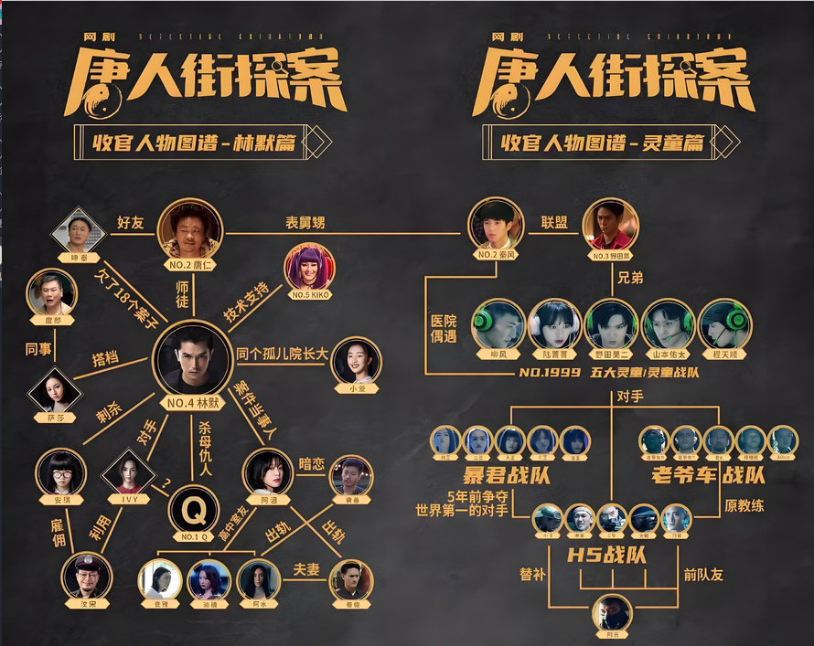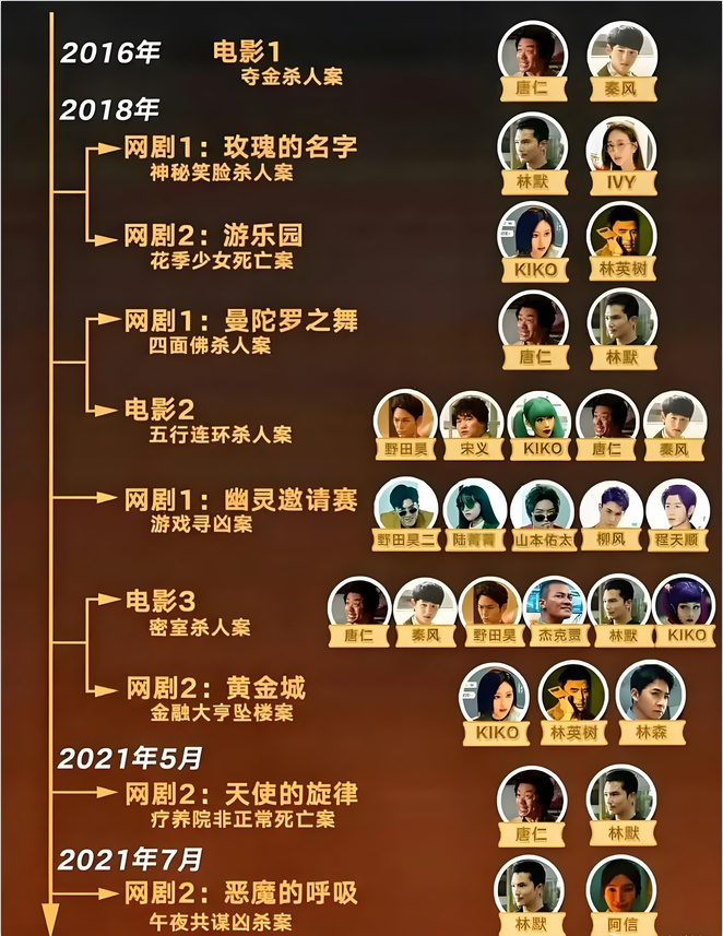 目前,《唐人街探案》系列已經(jīng)擁有四部電影和兩部網(wǎng)劇,由一個(gè)叫做“CRIMASTER世界偵探排行榜”的概念串聯(lián)而成。官方發(fā)布了電影和網(wǎng)劇案件發(fā)生的時(shí)間表和人物關(guān)系圖,更有“唐探”迷細(xì)細(xì)盤點(diǎn)了其間的人物關(guān)系: