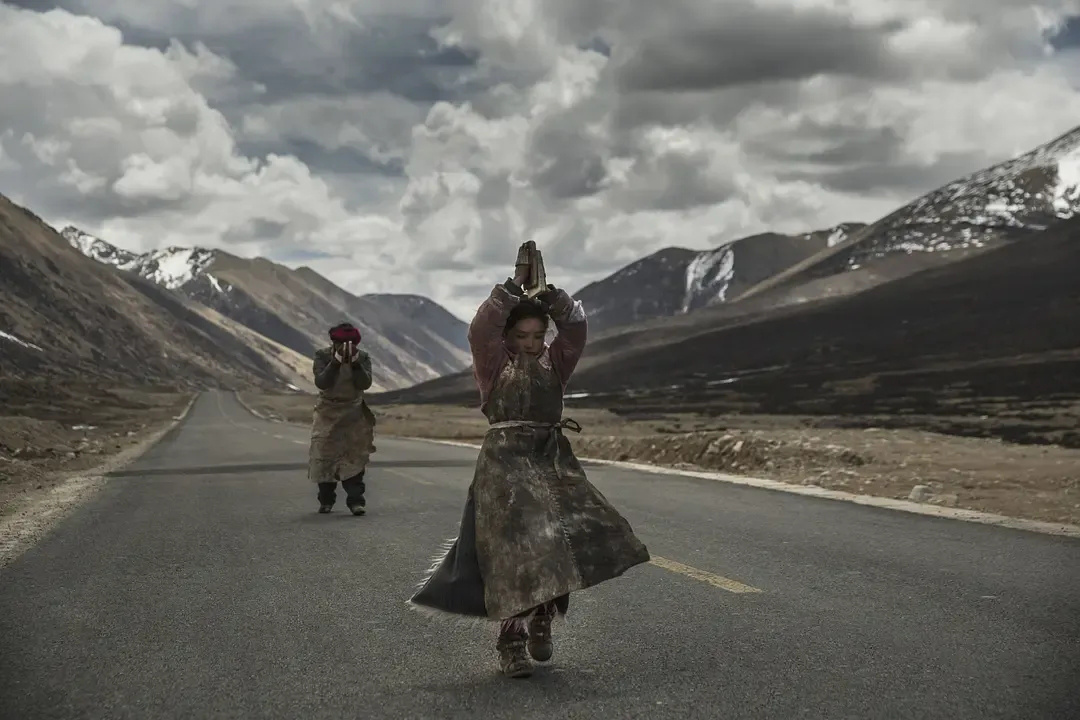影片用近乎紀(jì)錄片的手法,平靜地呈現(xiàn)這場朝圣之旅。沒有夸張的戲劇沖突,甚至沒有語言,只有日復(fù)一日的在通往神山的路上磕頭、搭帳篷、念經(jīng)。他們在路上迎來了新生兒,也送走了隨行的老人。