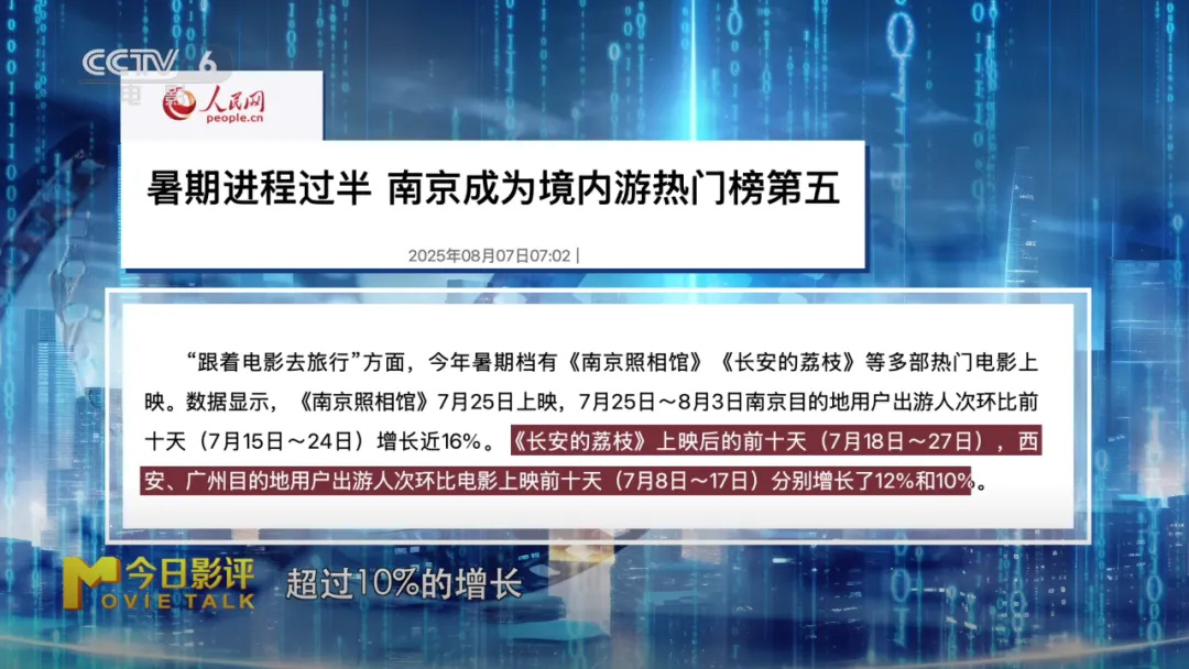 暑期檔的《長安的荔枝》講述了將荔枝從廣東運送到西安的故事。上映十天后,旅游平臺上西安至廣州的出行人數(shù)實現(xiàn)了超過10%的增長。