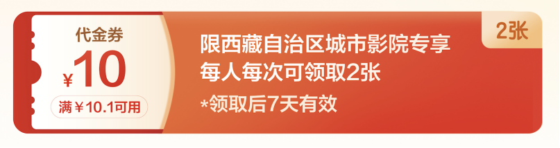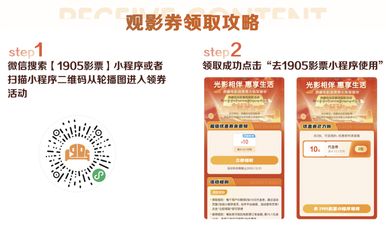 活動(dòng)期間,用戶可通過1905影票小程序領(lǐng)取“滿10.1元立減10元”觀影消費(fèi)券。每位用戶可領(lǐng)取2張,消費(fèi)券自領(lǐng)取之日起7天內(nèi)有效,可在西藏自治區(qū)內(nèi)所有合作影院使用,適用于活動(dòng)期間所有在映影片。這一舉措將切實(shí)降低群眾觀影成本,讓文化惠民政策落到實(shí)處。